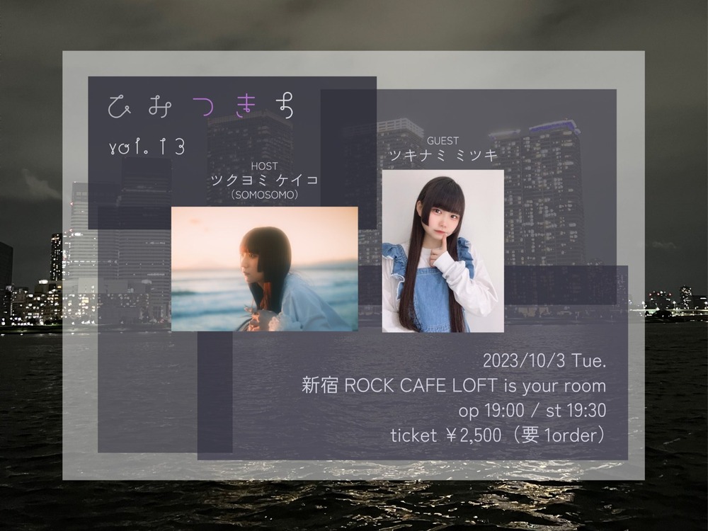 『ひみつきち vol.13』 SCHEDULE 2023/10/03(火) 19:00 - 22:00 新宿ROCK CAFE loft 《時間》19:00/19:30 《料金》¥2,500(+1D)限定19名 チケットを見る URLをコピーする 報告する
