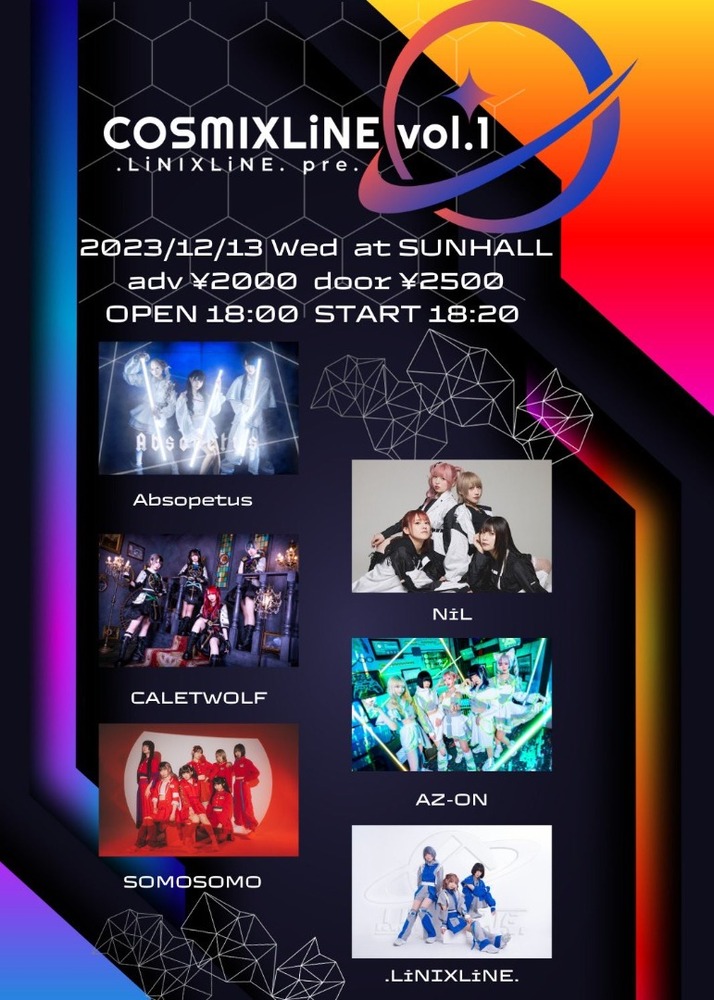 『COSMIXLiNE vol.1』 SCHEDULE 2023/12/13(水) 18:00 - 心斎橋SUNHALL 《時間》18:00/18:20 《料金》adv¥2,000/door¥2,500(+1D) チケットを見る URLをコピーする 報告する