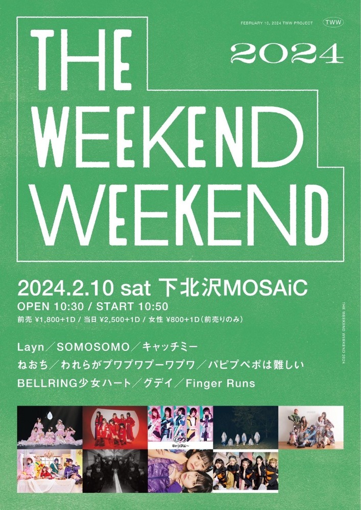 『the WEEKEND WEEKEND』2024 SCHEDULE 2024/02/10(土) 下北沢MOSAiC 《料金》 前売り ¥1,800 当日 ¥2,500 女性 ¥800(前売りのみ) 《出演》11:15-11:40 《物販》11:50-12:50 ※2/3更新 チケットを見る URLをコピーする 報告する