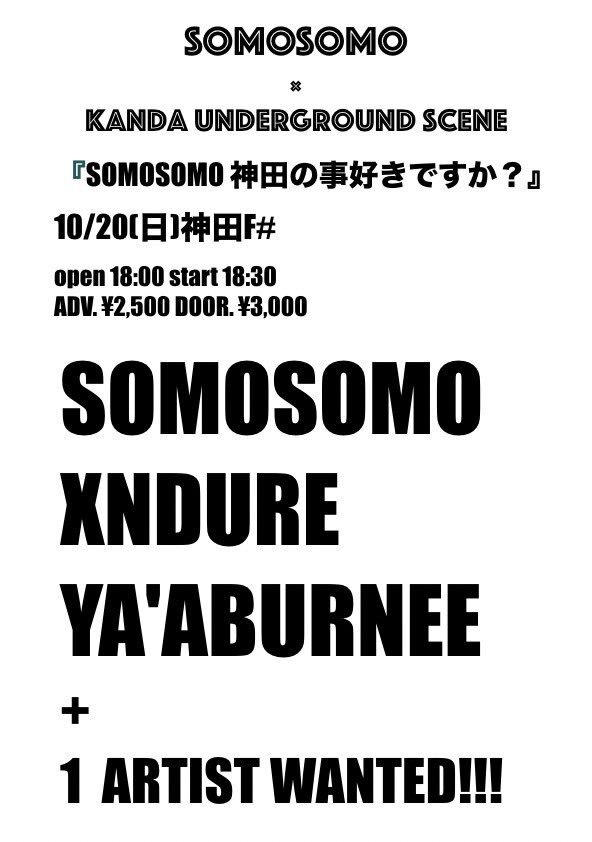 神田地下界隈×SOMOSOMO pre. 「SOMOSOMO神田の事好きですか?」 SCHEDULE 2024/10/20(日) 神田F# 《時間》18:00 / 18:30 《料金》前売¥2,500 当日¥3,000(+1D) チケットを見る URLをコピーする 報告する