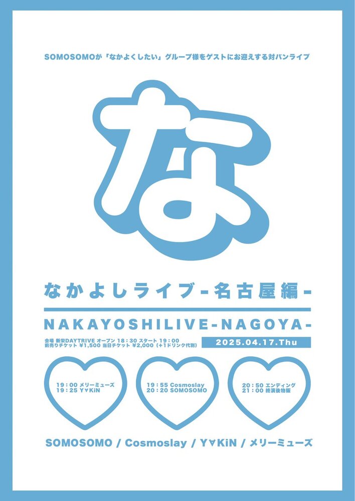 『なかよしライブ-名古屋編-』 SCHEDULE 2025/04/17(木) 《会場》新栄DAYTRIVE 《料金》前売¥1,500 当日¥2,000(+1D) 《出演》20:20-20:50 《物販》21:00-22:00 《イベント終了》22:00 チケットを見る URLをコピーする 報告する