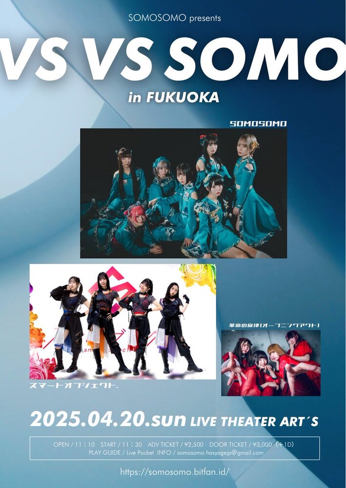 『VS VS SOMO in FUKUOKA』 SCHEDULE 2025/04/20(日) 《会場》LIVE THEATER ART´S 《時間》11:10 / 11:30 《終了時間》14:00 《料金》前売り¥2,500 当日券¥3,000(+1D) チケットを見る URLをコピーする 報告する