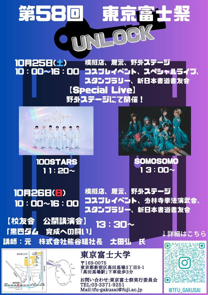 第58回 東京富士祭 『UNLOCK』 SCHEDULE 2025/10/25(土) 10/25(土) 第58回 東京富士祭 『UNLOCK』 【場所】東京富士大学 【時間】OPEN 10:00/CLOSE 16:00 【出演】13:00- 【特典会】13:40- 【料金・チケット】入場無料 URLをコピーする 報告する